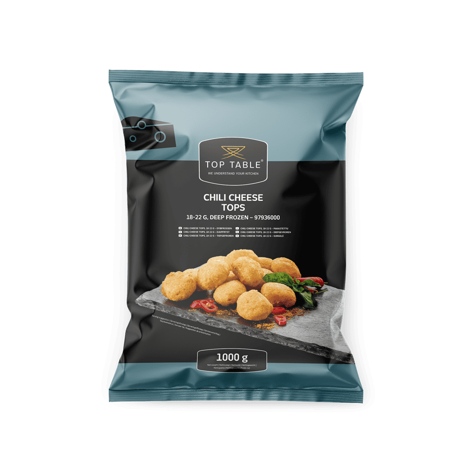 Vores Chili Cheese Tops kombinerer cremet, smeltet ost med et let spicy kick fra chili – alt sammen omsluttet af en sprød, gylden panering. Den perfekte balance mellem varme og fylde gør dem til en uundværlig klassiker på enhver menu.