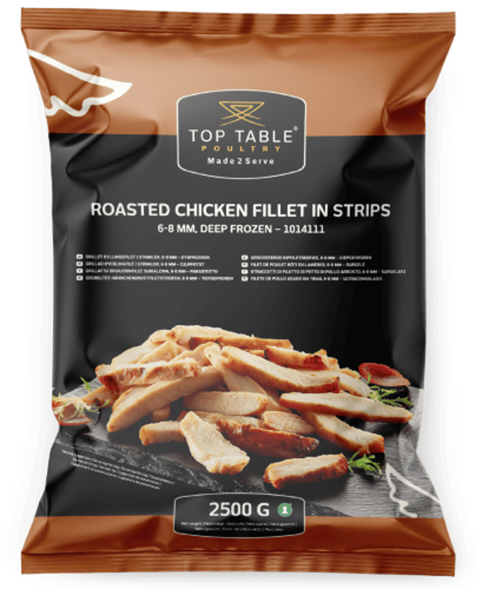 Du får med andre ord nogle smagfulde og indbydende kyllingestrimler med en høj, ensartet kvalitet. Og så frigiver du masser af tid i dit køkken, fordi strimlerne allerede er klar til servering. Anvend kyllingestrimlerne i både sandwich, pita, sliders og wraps. Eller oven på pizza, salater eller i en kyllingemix.