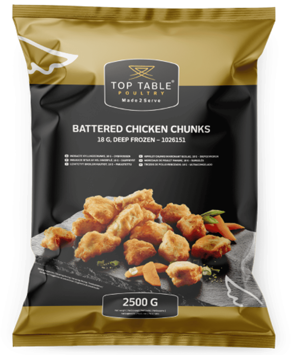 De fleste køkkener kan få glæde af vores indbagte kyllingechunks. De kan både serveres i asiatiske retter og i chinabokse, og de er også perfekte til børnemenuen eller som tallerkenret i fastfood-restauranten. Så snyd ikke dig selv – eller dine gæster – for de unikke chunks fra Top Table!