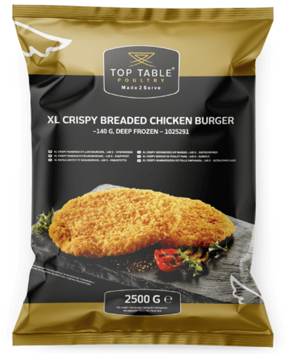 Vores XL Crispy Kyllingeburger fra Top Table rammer direkte ind i tidens trend om sprødstegt paneret kylling. Og går lige i hjertet hos de fleste burgerelskere!